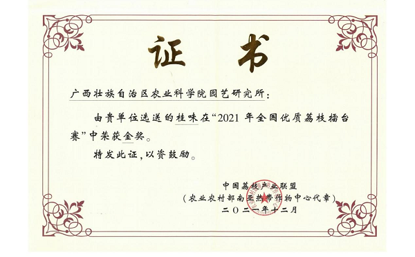 园艺研究所选送的‘桂味’荔枝获2021年全国优质荔枝擂台赛金奖发表时间:2023-05-25 00:25 由中国荔枝产业联盟(农业农村部农南亚热带作物中心牵头成立)举办的2021年全国优质荔枝擂台赛近日颁发获奖证书,园艺所选送的‘桂味’荔枝在本次比赛中荣获金奖。 本次擂台赛共收到农业农村部荔枝标准化生产示范园单位、各省荔枝标准化生产示范园等参评主体寄送的荔枝样品69份。经过指标检测、综合指标评比、专家组打分等,核算评出最终结果。共评选出金奖4项、银奖7项、铜奖11项。 园艺所选送的‘桂味’样品采至农科院院内基地,全程采用绿色防控技术,不使用化学杀虫药。通过释放天敌和光驱避法等技术防治荔枝害虫;通过合理修剪提高叶幕层高度和增加果园通风透光条件,减少病害发生;通过增加有机肥减少化肥用量,提高树体结果能力和果实品质。园艺所荔枝龙眼团队将以此为契机加快“荔枝生态高效栽培技术”集成推广应用,助力荔枝产业高质量发展。